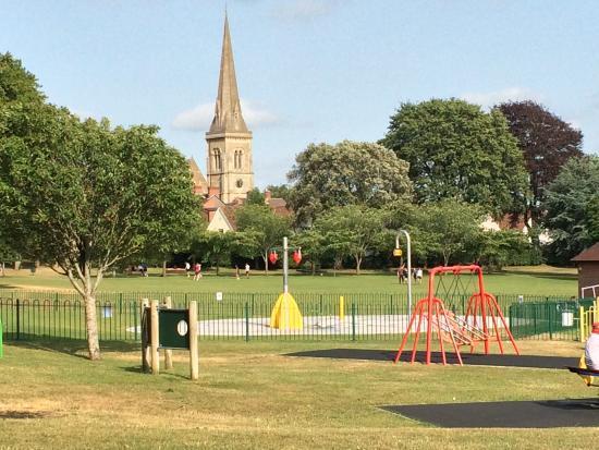 A large lovely local park with a wide variety of equipment and a splash pad. The park has a bandstand, tennis courts and lots of space for picnics. A small café is available for light snacks, drinks and ice cream.